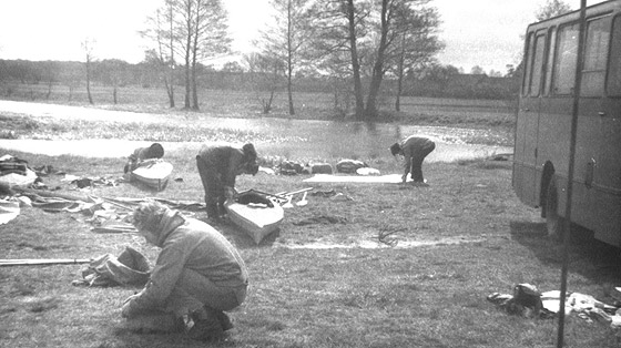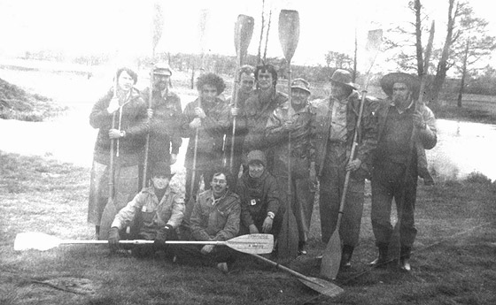 Kwiecień nie rozpieszczał nas wówczas ciepłem. Zimny, przenikający odzież wiatr, porywający z progu wodnego drobne kropelki wody, nękał nas wtedy najbardziej, ale i tu nie zabrakło nam inwencji. Ustawiliśmy namioty tak, by osłonić się od tego wiatru. Na zawietrznej rozpaliliśmy ognisko, wyjęliśmy z pokrowców gitary i przy odrobinie grzanego piwa, śpiewaliśmy do północy. Jurek wydał wskazówki dotyczące czekającego nas jutrzejszego etapu i opowiedział historyjkę z regat żeglarskich. Jurek ma liczne turystyczne pasje. Uprawia żeglarstwo ( obecnie jest jachtowym kapitanem żeglugi wielkiej), uprawia też turystykę pieszą nizinną i górską. Chętnie też jeździ na wycieczki i rajdy rowerowe a zimą, na narty. Po prostu wszechstronny turysta. Pokrzepieni ciepłym piwem, rozgrzani ciepłem bijącym od ogniska, zapomnieliśmy o zimnym wietrze i o wszystkich kłopotach dnia codziennego. Nazajutrz, wczesnym rankiem, postanowiliśmy jeszcze bardziej zadziwić kierowcę naszego autobusu, jako że nadziwić się on nam nie mógł, że w taki czas, kiedy, według jego oceny, porządni ludzie wbijają się w odświętne ciuchy i siadając w zaciszu domowego ogniska przed telewizorem, popijają ciepłą kawę, my jak jacyś odmieńcy, wyruszamy w zimny, niegościnny jeszcze plener, by mocować się z zawieruchą i zimnymi falami rzeki. Zadziwiliśmy go bardzo, przede wszystkim tym, że po tak zimnej nocy jeszcze żyjemy i na dodatek żadne z nas nie ma nawet śladu kataru, wprost przeciwnie, czujemy się na tyle świetnie, że w krótkim ( w jego mniemaniu, niesamowicie krótkim) czasie zwinęliśmy biwak i ustawiliśmy kajaki na wodzie. Jeszcze tylko tradycyjne zdjęcie i start!