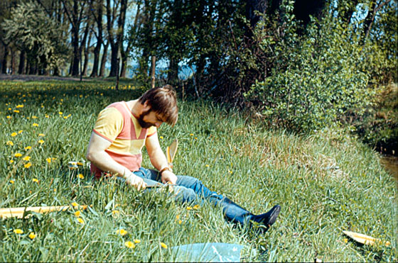 Niestety, podczas odpychania się od brzegów wąskiej Łagowy, uszkodziłem wiosło. Musiałem je naprawić i czynność ta została utrwalona na zdjęciu. Potem zaczęła się prawdziwa Pliszka, taka o której będziemy pamiętali do naszych ostatnich dni. Ten spływ śmiało można by zaliczyć do wprawki na obozie przetrwania. Proszę sobie wyobrazić, że my sami, dobrowolnie w tym uczestniczyliśmy! Kręcąca ciasne meandry w gęstym lesie rzeka, podmywała drzewa, które waląc się, nierzadko przegradzały jej bieg. Zmienialiśmy się co jakiś czas. To ja szedłem i oczyszczałem drogę kajakowi z gałęzi i mniejszych pni, a Jędrek wiosłował, to odwrotnie. Wreszcie rzeka wypłynęła na jakieś torfowisko i tam mogliśmy trochę odpocząć, normalnie płynąc. Dopłynęliśmy tak do wsi Pliszka, gdzie postawiliśmy namiot i przenocowaliśmy.