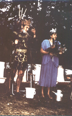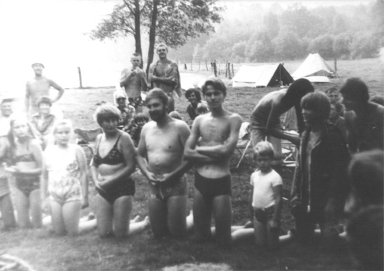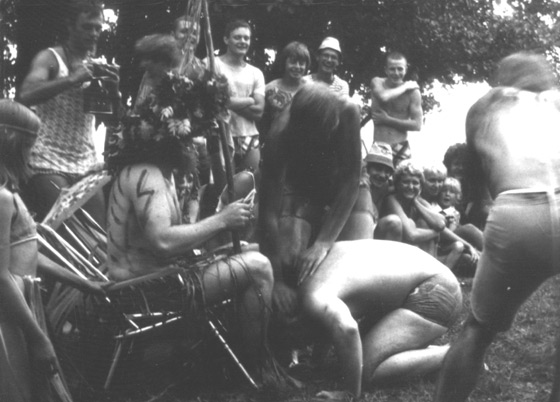 Potem należało oddać cześć Neptunowi. Klękało się przed nim na jedno kolano, a ten uderzywszy trójzębem w prawe ramię mówił: Nadaję ci prawo do pozostania w społeczności wodniackiej. Ciesz się wodą, słońcem i powietrzem. Chrzczę cię imieniem ... : ( mnie nadano SZPUNT). Po tej ceremonii diabły porywały z klęczek nowego wodniaka i powierzały jego losy nurtom rzeki ( oczywiście pod czujnym okiem spływowych ratowników). Tak to ze zwykłego "lądomana" przedzierzgnąłem się w wolnego od trosk życia codziennego, zapalonego "wodopływa".