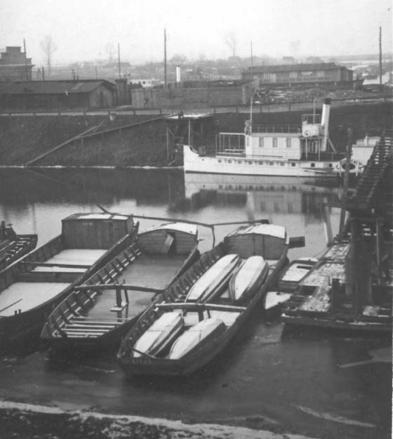 Krypy żaglowe na zimowisku w tzw. „porcie łyżwowym” w Płocku; dobrze widoczne sztemblochy z jętkami do masztu i kwarkowe wręgi; kadłuby węższe i proporcjonalnie znacznie wyższe burty niż u kryp z Wisły „puławskiej”; na drugim planie statek parowy Państwowego Zarządu Wodnego w Płocku bocznokołowiec inspekcyjno-holowniczy „Chodkiewicz” z kominem pomalowanym na srebrno z czarną obwódką na wierzchołku, stanowiącym rozpoznawczy znak armatorski statku administracji wodnej; w tle basen portu płockiego i wyslipowany kadłub „unrrowskiej” podczołgowej barki desantowej typu LCT, na której nadbudowano pomieszczenie widowiskowe dla Pływającego Teatru Ziemi Mazowieckiej (obecnie na cumach w ujściu rz. Rządzy na Jeziorze Zegrzyńskim jako przystań żeglarska firmy „Pomoc Wodna” kpt..ż.ś.  Jacka Paszki). Dalej w lewo komin statku holowniczo-inspekcyjnego „Wyspiański” i budynki warsztatów portowych. W tle brakuje sylwetki elewatora zbożowego, którego wówczas jeszcze nie było. Fragm. fot. aut., zima  r. 1949/50.