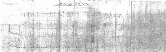 KRYPA „puławska” na szkicu sporządzonym przez Kierownika Warsztatów Stoczniowych Państwowego Zarządu Wodnego w Puławach w r. 1945. Z braku blach stalowych PZW-Puławy wybudował do r. 1948 około czterdziestu kryp drewnianych. Początkowo wstawiano wręgi drewniane z naturalnych krzywulców, ale wobec trudności z ich pozyskiwaniem zastosowano później wręgi ze stalowych kątowników, łączonych z drewnianymi zolami czyli dennikami, na których  położona była podłoga z tarcic. Na dziobie umiejscowiono windę kotwiczną z kotwicą na żurawiku. Na rufie znajdowała się wygodna kajuta i ster balansowy. Statek ten nie był zaopatrzony w sztembloch do masztu, ponieważ nie był przystosowany do chodzenia pod żaglem. Był on przewidziany do holowania pod wodę, a z wodą mógł iść samospławem. Krypy te do r. 1956 wykorzystywane były w eksploatacji przez  PZW i RDW Sandomierz, Puławy, Warszawa, Płock, Toruń, Chełmno i Tczew. Wymiary krypy: L = 30,0 m, B = 7,0 m, T1 = 0,15 m, T2 = 0,80 m, nośność 100 T. Szkic ze zbiorów prywatnych Dyrektora RZGW-Warszawa mgr. inż. Czesława Kowalskiego.