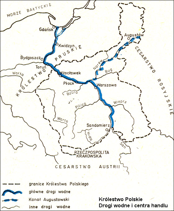 Na liście towarów eksportowanych na Zachód tradycyjnie już pierwsze miejsce zajmowało zboże i jego przetwory. Przy tym starym szlakiem wiślanym płynęło do Gdańska i z Gdańska około 90% eksportu i importu. Na władze Królestwa nakładało to obowiązek utrzymywania rzek w należytej spławności. I trzeba przyznać, że nie skąpiono na ten cel środków. W 1822 roku wydatkowano na uspławnianie poszczególnych rzek następujące sumy: Wisła - 93021 zł; Warta 18920; Pilica - 18340; Nida - 20000. W latach 1824-1828 rzeki Wisła, Narew, Pilica, Warta, Bug, Nida i Radomka doprowadzone zostały do stanu bezpiecznej żeglowności. Dzięki tym pracom Radomka - lewy dopływ Wisły - została na odcinku 5 km skanalizowana. Prowadzone w latach 1824-1825 prace hydrotechniczne na Wiśle pochłonęły 295 tys. zł, Warcie - 101 tys. zł, Nidzie - 132 tys. zł. Wpłynęło to pozytywnie na ożywienie żeglugi wewnętrznej w Królestwie. Rozwój żeglugi na dolnej Wiśle, Warcie i Odrze zależał w głównej mierze od polityki celnej Prus. Konwencja celna rosyjsko-pruska była niekorzystna dla handlu zagranicznego Królestwa i Rosji. Zbyt późno zorientowawszy się w tym, Rosja proponowała Prusom poddanie rewizji podstawowych zasad traktatu celnego, ale te odmówiły jakichkolwiek negocjacji na ten temat. Przeciwnie, w październiku 1821 roku bez porozumienia z Rosją zwiększyły nieznacznie opłaty celne za tranzyt polskich płodów rolnych do Gdańska i Szczecina. Występująca poprzednio niezbyt zdecydowanie Rosja, dotknięta tym razem bardzo mocno stanowiskiem Prus, zerwała w 1822 roku konwencję, wprowadzając wspólnie z Królestwem Polskim nową protekcyjną taryfę celną, zabezpieczającą przemysł krajowy przed konkurencją sprowadzanych z krajów niemieckich wyrobów przemysłowych.