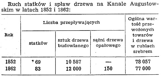 Porównanie przedstawionych w tabeli danych uzyskanych z raportów gubernatora augustowskiego pozwala stwierdzić niewielki tylko w ciągu 10-lecia wzrost liczby przepływających kanałem statków i sztuk drewna budowlanego. Natomiast wartość spławianych towarów zmniejszyła się nawet o ponad 1000 rubli.