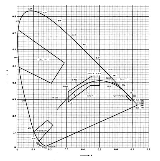 2. Granice obszarów każdego koloru określone są współrzędnymi punktów narożnych na wykresie chromatyczności CIE publikacja nr 2.2 (TC-1.6) 1975 (patrz wykres chromatyczności) i wyszczególnionych w tabeli nr 1.