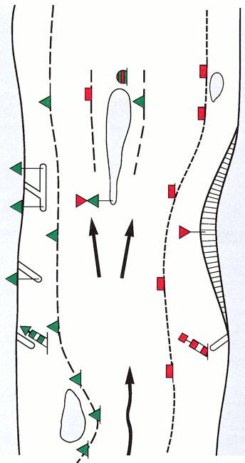 a) z lewej strony wejścia - tyka czerwona lub tyka z czerwonym walcem jako znakiem szczytowym albo czerwony trójkąt jednym wierzchołkiem w dół, namalowany na nabrzeżu,