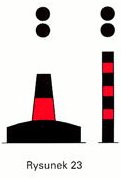 Znak szczytowy: tablica kwadratowa z czarnymi i białymi pasami pionowymi lub tablica utworzona ze szczebli pionowych białych lub czarnych