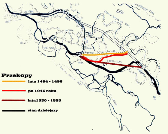 Na terenie objętym od północy systemem meandrów najstarszej Odry, od zachodu osiedlami Starych Szczytnik, Zielonego Dębu i Bartoszowic, a od wschodu i południa obecna Odrą Miejską wybudowano w sumie trzy przekopy. Pierwszy w latach 1494 – 1946 łączący Sępolno z dzisiejsza Przystania Zwierzyniecką, drugi przekop wykonany w latach 1530 – 1555 łączył Opatowice z Zielonym Dębem i Przystanią Zwierzyniecką i trzeci przekop łączący Dąbie z osadą Sępolno. Przekop z lat 1530 – 1555 znajdował się na północ od Opatowa i łączył się ze Starą Odrą ( Zwierzyniecką ) Powstała w ten sposób wyspa Opatowicka ujęta od wschodu Starą Odrą, od północy Odrą Miejską i od południa przekopem. Budowa przekopu spowodowała powstanie drugiej wyspy tzw. Wielkiej, w której centrum leżał Biskupin. Jak widać budowa kanałów była ponawiana, lecz dopiero ostatnia próba z lat 1530 – 1555 powiodła się i Odra utrzymała się w nowym korycie funkcjonującym do czasów dzisiejszych.