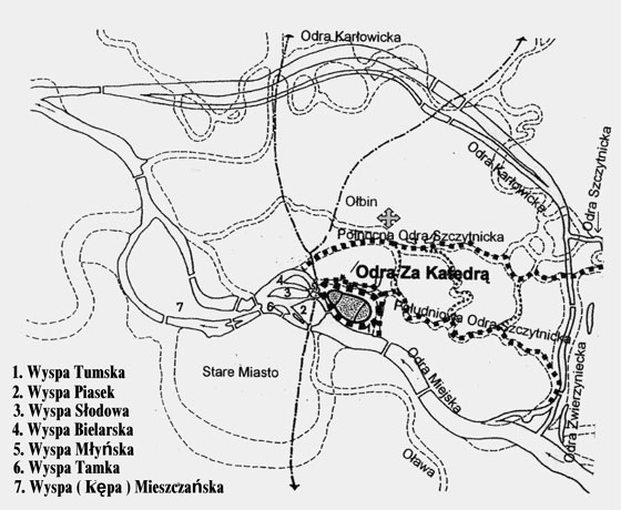 Na obszarze starego centrum Wrocławia Odra dzieli się na kilka ramion, wydzielając zespół wysp. Obecnie jest ich 10, ale przed rokiem 1807 było ich więcej. Wyspy podzielić można na grupę wschodnią i zachodnia. Do wschodniej grupy należą : Ostrów Tumski, Piasek, Młyńska, Słodowa, Bielarska i Tamka, a także nieistniejące już dziś wyspy Św. Klary i Św. Brygidy. Na najwyższej wyspie – Ostrowie Tumskim - powstał w X wieku gród wraz z podgrodziem. Otaczała go od południa i zachodu Odra Miejska, a od wschodu i północy Odra Za Katedrą.