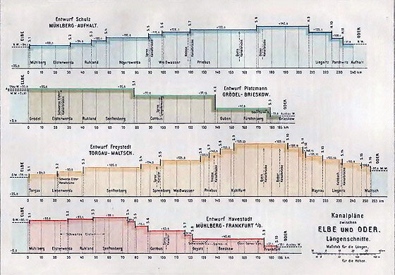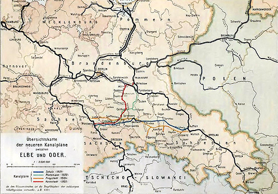 I tym sposobem już przed 150 laty wszystkie części państwa pruskiego od Księstwa Magdeburskiego aż po Litwę jak również Śląsk i Pomorze poprzez drogi wodne były ze sobą połączone, a od tej też pory istniejące już drogi wodne były ciągle przebudowywane i ulepszane aby sprostać wymogom czasów nowożytnych. W szczególności przestarzałe stały się oba stare kanały oraz na przełomie wieków dokończony kanał Odra – Szprewa, co w konsekwencji doprowadziło do tego, że na krótko przed I wojną światową uzupełnione zostały Kanałem Hohenzollernów i od tej pory statki o nośności 500 ton mogły już pływać pomiędzy Berlinem i Górną Odrą, a 600 tonowe od Łaby docierać do Szczecina. Jak mapa poglądowa pokazuje powstała dogodna droga wodna łącząca Górnośląski Okręg Przemysłowy wraz jego głównym portem przeładunkowym Koźle poprzez Berlin z Hamburgiem Także połączenie górnej Odry ze środkową Łabą w okolicach Magdeburga wraz z połączeniem środkowej Łaby z dolną Odrą spełnia istniejące oczekiwania. Jednak brakuje spełniającej te same wymogi drogi wodnej od górnej Łaby do środkowej i górnej Odry. Wykorzystanie istniejących dróg wodnych dla ruchu pomiędzy tymi rzekami spowalnia długi objazd który musi przechodzić przez Magdeburg, więc tamtejszy ruch floty śródlądowej w tych relacjach konkurować z koleją nie może. Dla tego też w ostatnim czasie było projektowanych kilka planów kanałów poprzez które powstały by dobre połączenia wodne z jednej strony od górnej Łaby do środkowej i górnej Odry z drugiej strony.