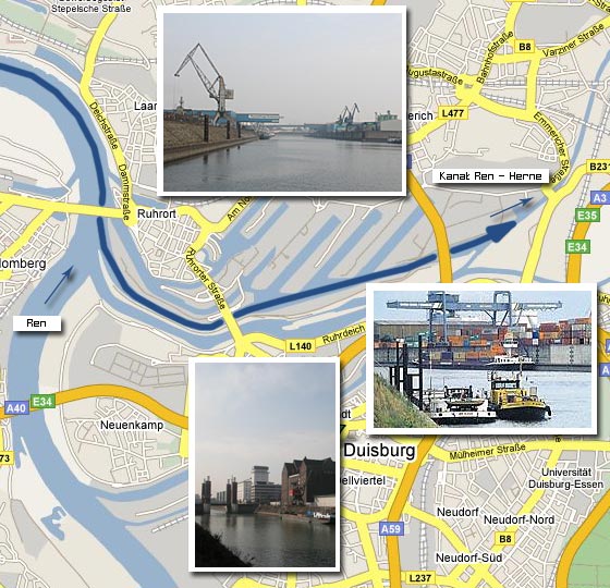 Dalszy rejs w górę Renu przebiegał już bez niespodzianek. Płynąłem tym razem do Duisburga - (rys. powyżej), aby kanałami Ren-Herne i Dortmund-Ems przeskoczyć do Dortmundu - portu docelowego ładunku z Belgii. Duisburg zawsze robił wrażenie na śródlądowym marynarzu z Polski. To największy port rzeczny w Europie: 21 basenów portowych ma łącznie 180 hektarów powierzchni, długość nabrzeży wynosi 40 km z czego 15 km to nabrzeża z bocznicami kolejowymi. Ponieważ docierają tu niewielkie statki morskie przystosowane do rejsów w górę Renu - Duisburg bywa określany "najdalej na zachód leżącym portem morskim Niemiec". Jest jednak bezsprzecznie komunikacyjnym przedłużeniem dla portów Rotterdamu, Amsterdamu i Antwerpii, w których ładunki przeznaczone w głąb Niemiec przeładowuje się z morskich statków na śródlądowe. Nie zatrzymywałem się w porcie, ale chcąc jak najdalej tego dnia dotrzeć popłynąłem do wlotu kanału Ren-Herne. Kanał Ren-Herne łączy Ren z siecią kanałów niemieckich. Przystosowany jest dla statków o nośności do 1350 ton. Budowano go w latach 1906-1914 a w 1916 ukończono siedem śluz na jego trasie. Prześluzowałem pierwszą w Duisburg-Meiderich i dotarłem wieczorem do śluzy Gelsenkirchen - (fot. powyżej), gdzie zostałem na noc w dolnym stanowisku.