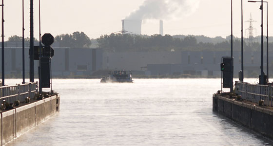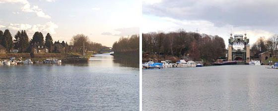 Nazajutrz kontynuując rejs pokonałem pozostałe śluzy i wypłynąwszy z ostatniej - Herne-Ost (u góry) - poczułem już przedsmak końca trasy z tym ładunkiem. Jeszcze kilkadziesiąt minut jazdy i blisko 46 kilometrowy kanał Ren-Herne uchodzi do kanału Dortmund-Ems (u dołu po lewej).