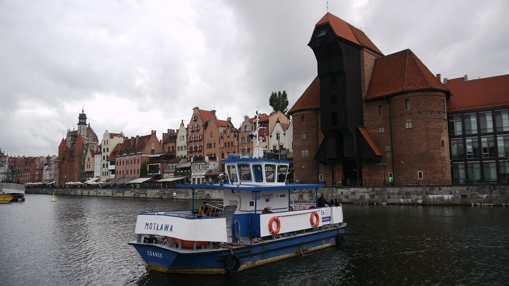 Nadmotławskie Długie Pobrzeże z charakterystyczną sylwetką Żurawia. Gdańsk 2019.10.04