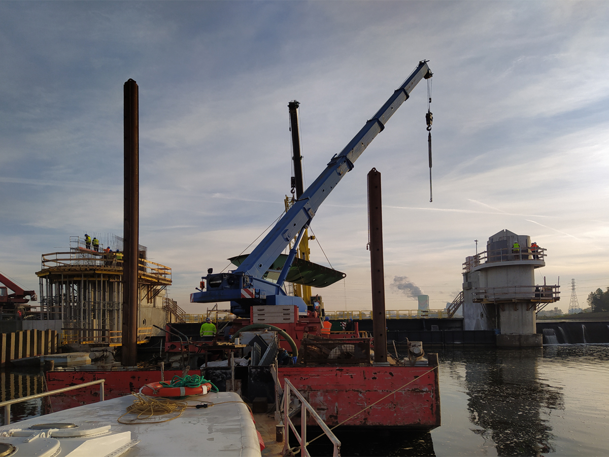 Przebudowa jazów Górnej Odry z sektorowych na klapowe. Montaż elementu klapy w pierwszym przęśle jazu Dobrzeń.