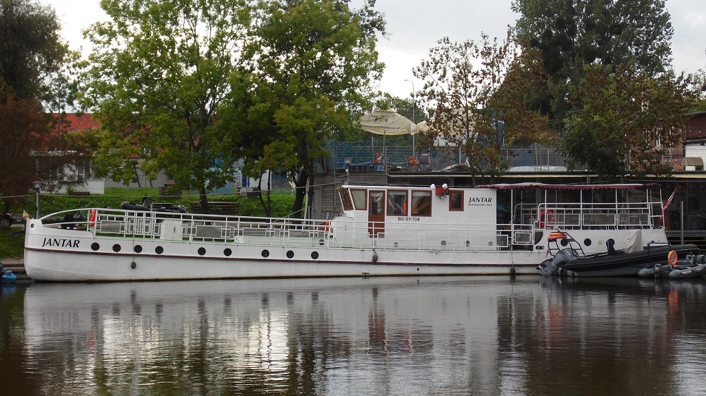 Inne ujęcie statku pasażerskiego JANTAR na rzece Elbląg w Elblągu.