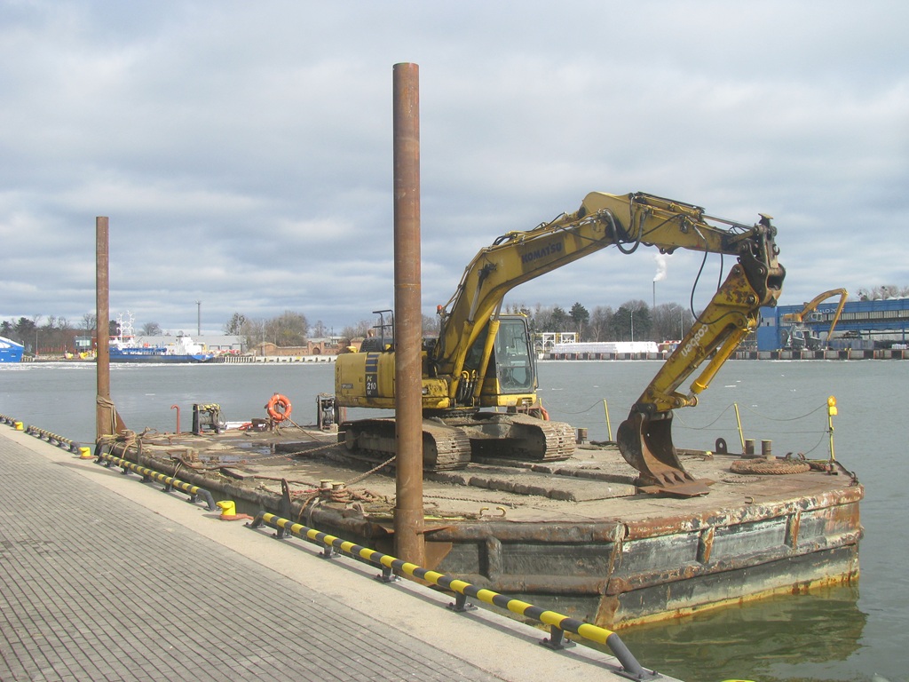Ponton roboczy z koparką łyżkową zacumowany w gdańskim porcie.