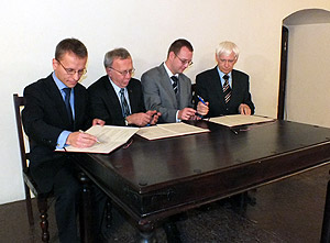 Od lewej: Michał Wilkowski - Prezes Zarządu MEW S.A., Leszek Karwowski - Prezes KZGW, Zbigniew Siedlarz i Mieczysław Janusz Jagła - Stowarzyszenie Miłośników Ziemi Niepołomickiej