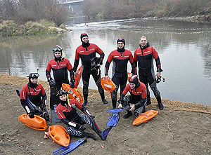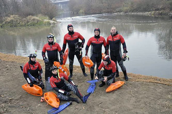 - Woda w rzece jest leniwa jak miś koala. Nie płyniemy z nurtem, polegamy wyłącznie na własnych nogach, opierając ręce na desce i odpychają się płetwami - mówi Tyka. Do wody wskakują ubrani w tzw. mokre pianki - skafandry chroniące ich przed wychłodzeniem, ale nieizolujące całkowicie od wody.
