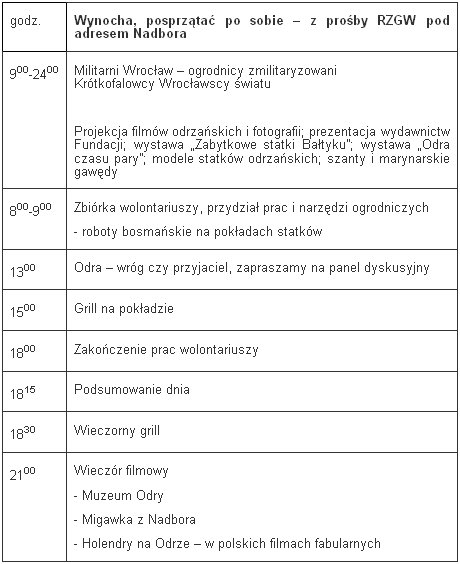 Od świtu do zmroku będziemy upominać się też o Muzeum Odry, przez Fundację Otwartego Muzeum Techniki stworzone, jedyne na Odrze, od Gliwic po Szczecin, zasadzone na trzech zabytkowych statkach odrzańskich, na HP Nadbor, na DP Wróblin, na barce „Irena”. Proponujemy otwartą formułę spotkania, improwizowanego, ale chcemy usłyszeć Wasz głos, zaprosić do czynnego udziału w walce o Odrę dla Wrocławia, wspólnie upomnieć się o nasze niezbywalne prawo współdecydowania o rzece, jej zagospodarowaniu, o bezpieczeństwie nad wodą, o pożądanych kierunkach rozwoju, odbudowy zniszczonej infrastruktury etc.