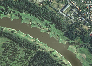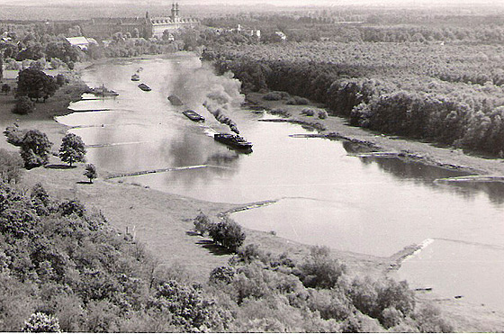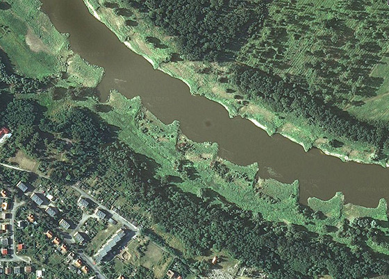 Odra w okolicach Lubiąża w latach 60 XX wieku (u góry) i ten sam odcinek na zdjęciu satelitarnym obecnie (poniżej)