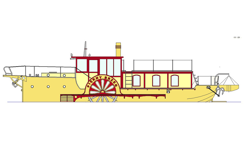 Dla przypomnienia: długość 12,75(~15m. z bukszprytem), szerokość w tamborach ~5m, zanurzenie 46cm, szerokość kadłuba 3,2m. Wyporność 11ton. Napęd diesel 136KM (Mercedes 6cyl - marynizowany). Napęd główny - zespół diesel-pompa hydr. o regulowanej wydajności. Silniki hydrauliczne umieszczone w piastach kół łopatkowych (średnica kół 2,4m). Dwa stery strumieniowe, hydrauliczna maszyna sterowa.
