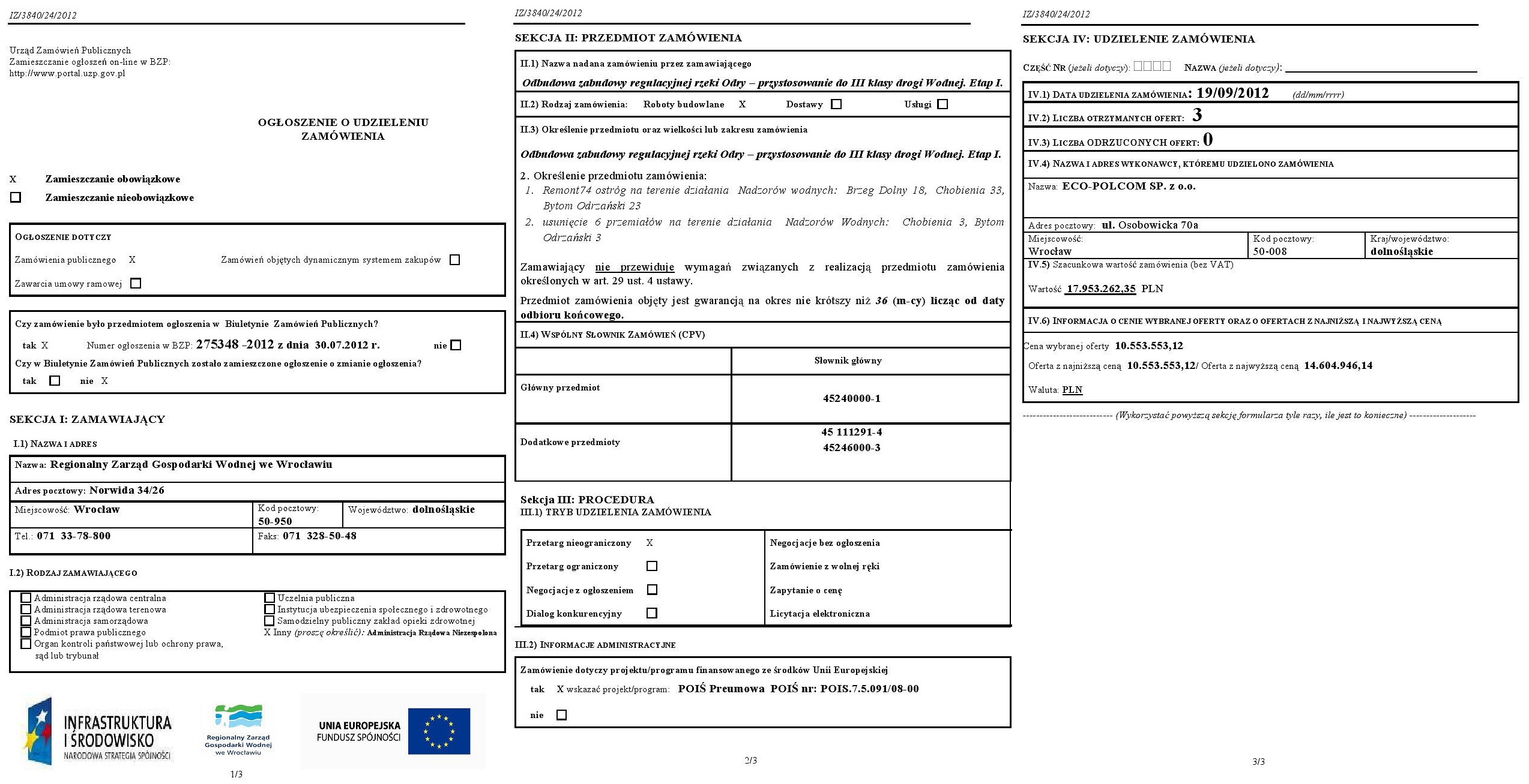 przetargi-polska.com RZGW wyłoniło zwycięzcę przetargu - wrocławską firmę Eco – Polcon SP. z o.o.