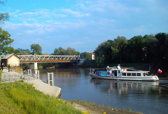 Statek rejsowy "Oława" pod kpt. A Podgórskim - gospodarzem brzeskiej mariny - podchodzi do przystani w Brzegu podczas rejsu "Z orkiestrą po Odrze".