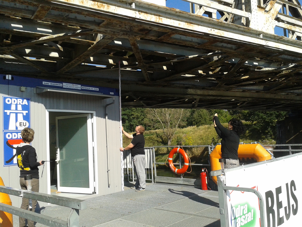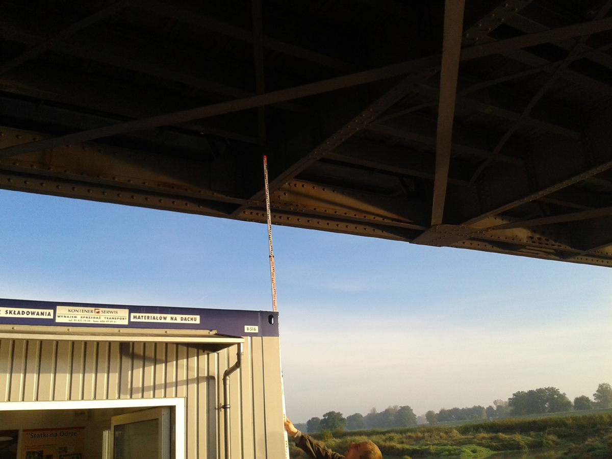 Wnioski: Pomimo bardzo wysoko zawieszonej poprzeczki (sztucznie podniesiony niemal do granicy stanów wysokich poziom wody Odry Środkowej) i podróżowania naszym zestawem z kontenerami z jak najmniejszym zanurzeniem barki (czyli bez balastu) - pomiary prześwitów w mostach wykazały spory zapas.