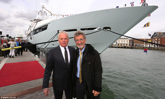 Dyrektor stoczni Sunseeker Robert Breithwaite wraz z Eddie Jordanem bezpośrednio po chrzcie statku w Poole