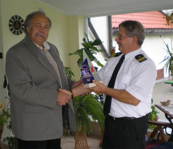 W dniu 9.09.2007 absolwent TŻS '67 i członek Towarzystwa Entuzjastów Żeglugi Śródlądowej Zbyszek Konopka wręczył w imieniu Załogi Wirtualnego Statku (wspoomnianą wcześniej w innym newsie) nagrodę uznania naszemu Kapitanowi - Andrzejowi Podgórskiemu.