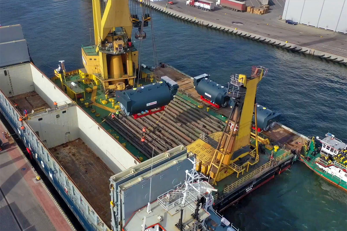 Kotły dotarły do Elbląga drogą morską i wodami śródlądowymi. Najpierw statkiem morskim do Gdańska. Tam, 23 marca, przy nabrzeżu WOC przeładowano, używając dźwigu pływającego Maja, trzy zbiorniki o masie po 91 ton ze statku Wilson Amsterdam na barkę rzeczną, na pokładzie której dotarły do odbiorcy w Elblągu.