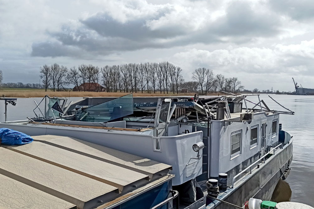 Załadowany statek uderzył sterówką podczas przejścia zamkniętego obrotowego mostu kolejowego Elfleth/Ohrt. Sterówka została całkowicie zepchnięta i zniszczona. Samochód kapitana zaparkowany na dachu pomieszczeń mieszkalnych za sterówką i ponton, który również tam był, zostały zepchnięte za burtę do Hunte.