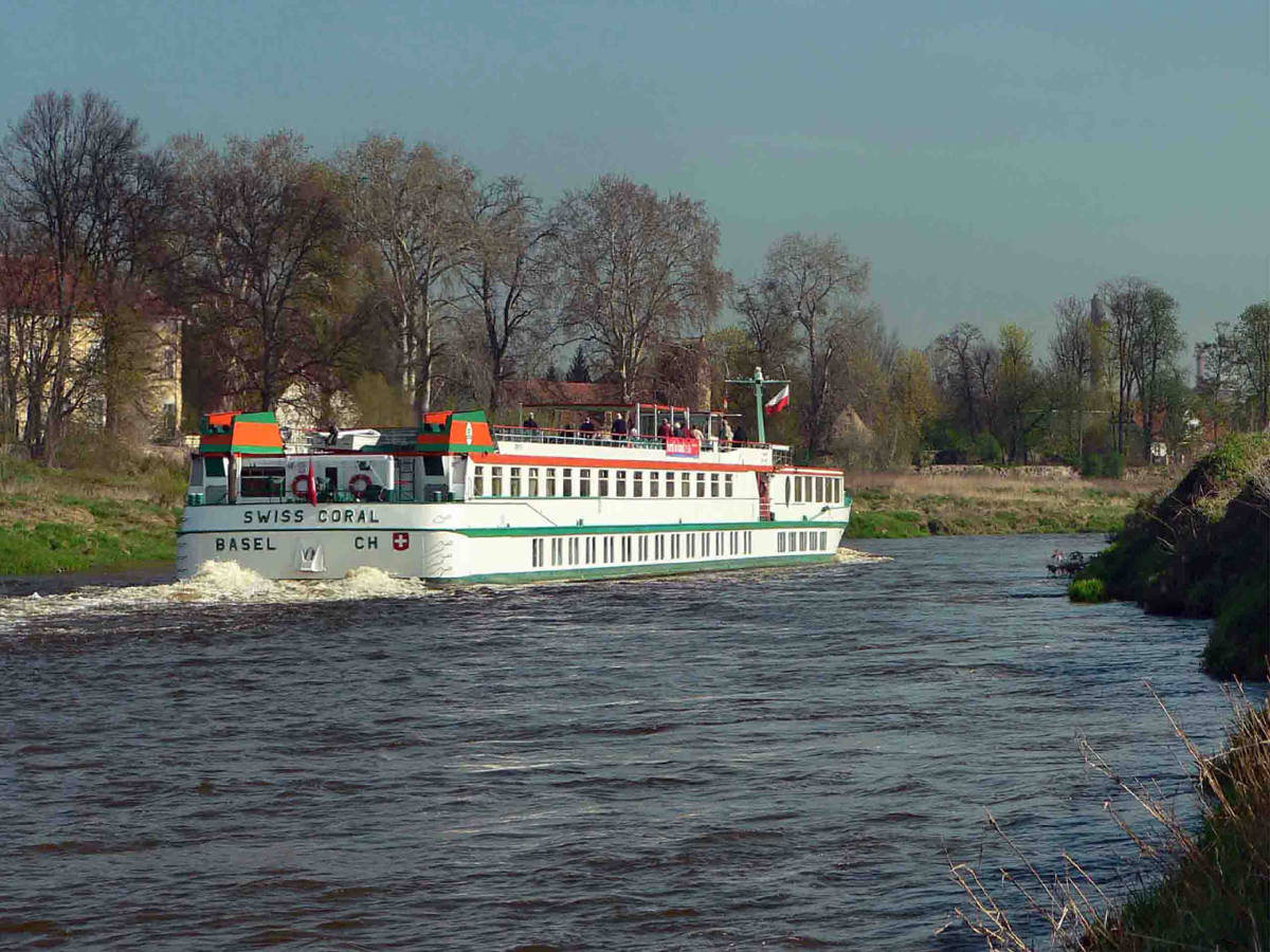 foto (ilustr.): Janusz Fąfara. Hotelowiec bandery szwajcarskiej mija pałac w Brzegu Dolnym płynąc Odrą w górę do Wrocławia.