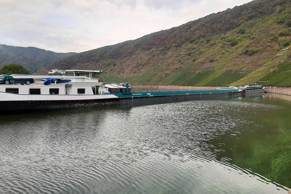 Zestaw pchany idący w górę zderzył się z nieznanego powodu z nadjeżdżającym statkiem pasażerskim na wąskim gardle w Mozeli km 63.700 w piątek wieczorem 23.09.2022. Towarowy statek motorowy uderzył następnie w ścianę nabrzeża na B 49, a następnie utknął w obszarze płytkiej wody w pobliżu brzegu.