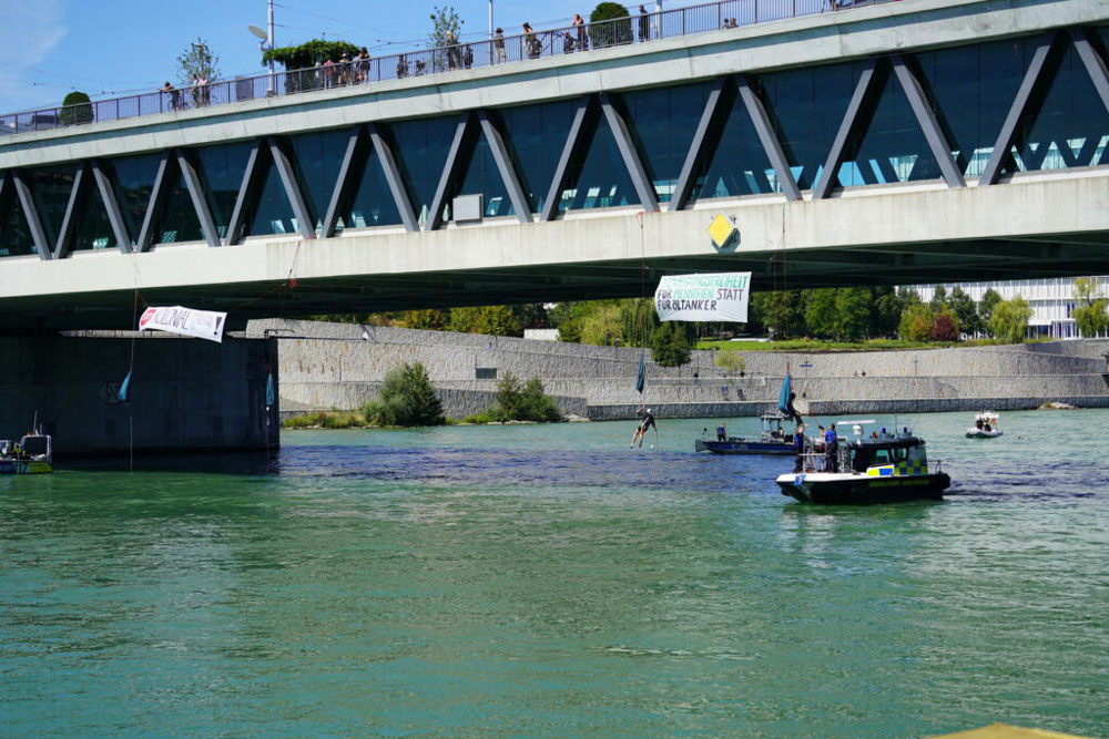 Pod hasłem „swoboda przemieszczania się dla ludzi, nie dla tankowców” aktywiści klimatyczni zjechali na linie z Dreirosenbrücke w Bazylei. Swoją akcją zablokowali żeglugę na Renie na kilka godzin.