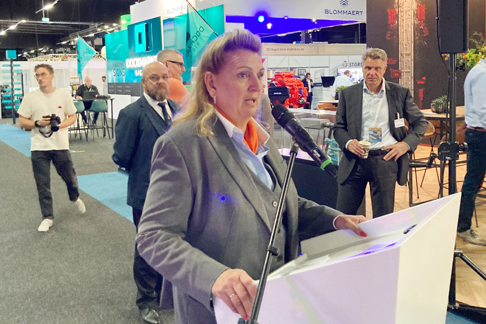 Targi STL 2023 otworzyła Michaela Schmidt (na zdjęciu), menadżerka targów Kalkar. Powitała ponad 100 wystawców. W swoim przemówieniu Schmidt zwróciła uwagę na licznych nowych wystawców i jednocześnie podziękowała 14 firmom, które od początku pozostały wierne targom. Są tam co roku od pierwszego STL. Oprócz takich firm jak HA-DU, FS Schiffstechnik, Kadlec i Wittig wśród pierwszych wystawców znalazł się także magazyn „Binnenschifffahrt”. W dowód uznania otrzymali nagrodę oraz kosz upominkowy od Michaeli Schmidt.