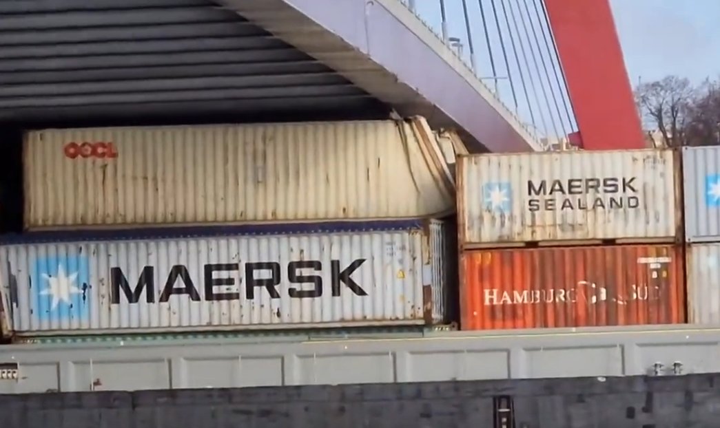 Barka kontenerowa zarejestrowana w Niemczech 1 marca utknęła na krótki czas pod mostem Willems w Rotterdamie z powodu błędnie oszacowanej wysokości ładunku.