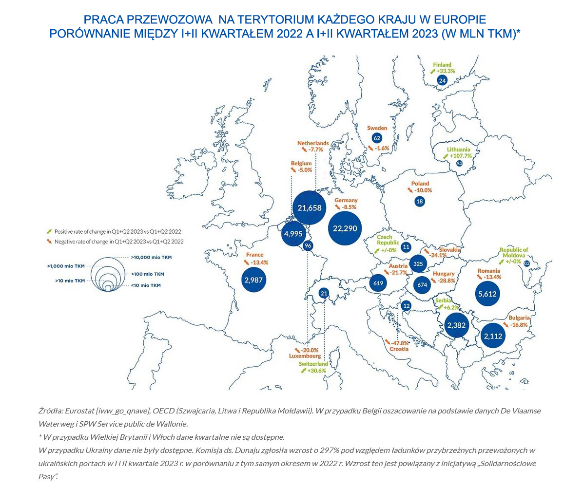 W dwóch krajach o najwyższej przepustowości transportu wodnego śródlądowego, czyli w Niemczech i Holandii, nastąpił spadek przepustowości odpowiednio o 8,5% i 7,7%. W odniesieniu do poszczególnych rodzajów ładunków największy procentowy spadek zaobserwowano w ruchu kontenerowym, a następnie w ruchu ładunków suchych. Było to konsekwencją spadku światowego handlu i produkcji przemysłowej. Ruch towarowy na całym Renie sięgnął w I półroczu 2023 roku 131,7 mln ton (-10,8%). W przypadku Renu recesja i spowolnienie handlu światowego również najbardziej ucierpiały w transporcie kontenerowym i transporcie towarów suchych.