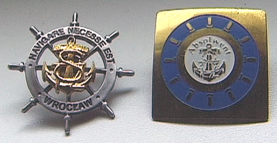 Odznaka wygląda dokładnie tak, jak ją przedstawiałem w wizualizacji i sądzę, że grawer wykonał ją fantastycznie. Ma ok. 2,5 cm średnicy, rytowane litery na kole sterowym i złoty emblemat Naszych Szkół odtworzony bardzo wiernie zważywszy skalę. Poniżej porównanie wielkości poprzedniego i obecnego znaczka, co da wszystkim posiadaczom poprzedniego pewne wyobrażenie o nowym i jego rzeczywistej wielkości. Gorąco namawiam wszystkich do zapisywania się na kolejną transzę. Jak już informowaliśmy - odznakę mogą mieć także sympatycy - nie tylko Absolwenci i Nauczyciele. Sprzyjać to będzie propagowaniu idei powrotu szkolnictwa żeglugowego do Wrocławia. NAVIGARE NECESSE EST!