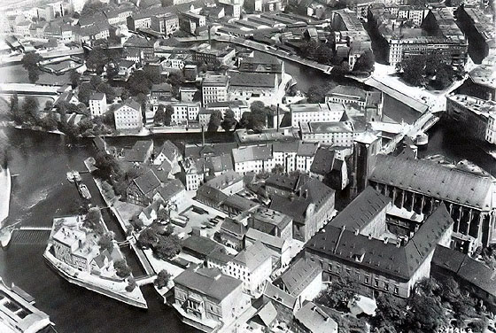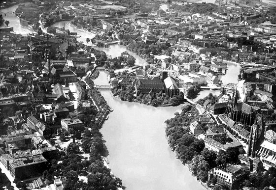 Widok z lotu ptaka na centrum Wrocławia pierwszej połowy XX wieku