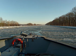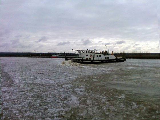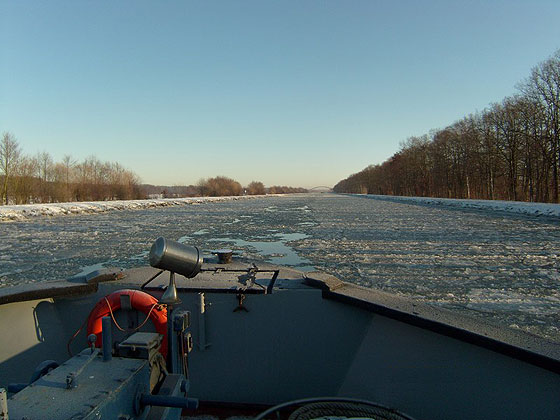 Obudził mnie lodołamacz przecierający szlak w kierunku wschodnim. Uruchomiliśmy maszynę i ruszyłem za nim.W Sende było ju ciężko.Pomyślałem, że dopłynę do Braunschweigu i tam zadecyduję o dalszej jeździe.Jednak w Mehrum nie dało już rady samodzielnie przedzierać się przez lody.