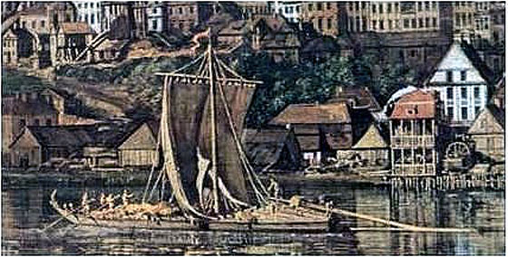 Szkuta pod żaglem w Warszawie, idąca pod wodę. Przy słabnącym wietrze flisacy w części dziobowej „podciągają” statek na pojazdach. Z lewej strony żagla widoczne liny trzymające maszt od dziobu – sztak i obsztak. Żagiel podkasany na tresce, „coby styrnik widział do przodu”. Na topie masztu czerwony wimpel. Sternik dzierżący amolec lewą ręką opartą na gawełku, stoi na pochodzie, desce wspartej na sztalugach. Na rufie szkuty monstrualny ster ˛/5 długości statku, służący do rozpędzania szkuty przy samospławie. Ster po długotrwałej żegludze nasiąknięty wodą z tendencjami do tonięcia, jest równoważony postawioną na amolcu skrzynią z kamieniami lub piaskiem. Szkuta pod trudnym do ustalenia ładunkiem. Statek ten jako szczegół na „Panoramie Warszawy od strony Pragi” Bernarda Belotto Canaletta z r. 1770, jest w porównaniu z innymi przedstawieniami, najdoskonalszym ujęciem szkuty pod względem wielu szczegółów i zachowanych proporcji, z wyjątkiem braku obcei i karnatów – lin utrzymujących maszt czyli wantów i padunów, których prawdopodobnie z tak dużej odległości (z prawego, praskiego brzegu pod Golędzinowem!) znany z drobiazgowości malarz nie widział.