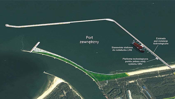 By statki z gazem mogły dopłynąć do Świnoujścia, w odległości około kilometra na wschód od wejścia do portu budowany jest prawie 3-kilometrowy falochron, który będzie częścią nowego portu zewnętrznego. Inwestycja ma się zakończyć do 2012 roku, natomiast terminal ma być gotowy do końca 2013. Pierwsze statki mają przypłynąć do Świnoujścia w połowie 2014 roku.