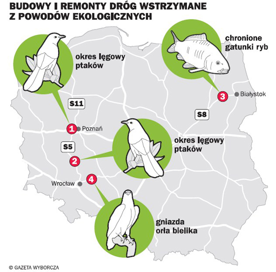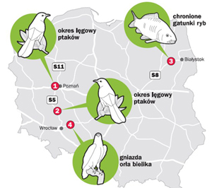 1) Pod koniec marca przerwano prace przy zachodniej obwodnicy Poznania (S11), która miała być gotowa na Euro 2012. Trasa przebiega przez dolinę rzeczki Samicy, która znajduje się w obszarze Natura 2000. Swoje ostoje ma tam kilkanaście gatunków ptaków, dla których zaczął się okres lęgowy. - Decyzja środowiskowa wydana przez Regionalna Dyrekcję Ochrony Środowiska jest bezwzględna: od końca marca do września nie możemy nic robić - mówi Piotr Chodorowski, wicedyrektor GDDKiA w Poznaniu.