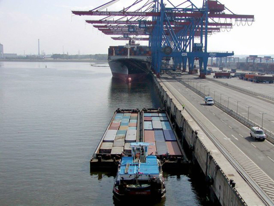 Port w Hamburgu: kontenery ze statków morskich przeładowywane są na barki rzeczne. Czy podobnie będzie wkrótce w portach w Gdańsku i Gdyni?