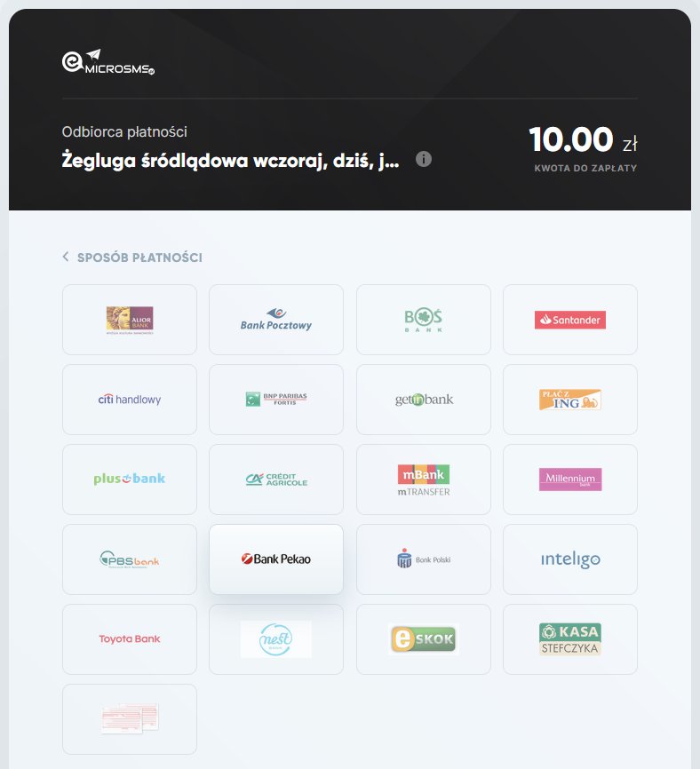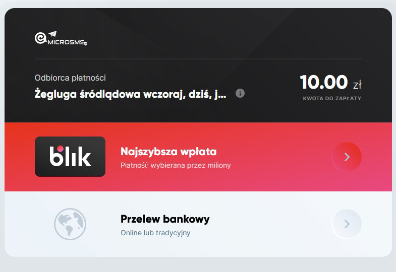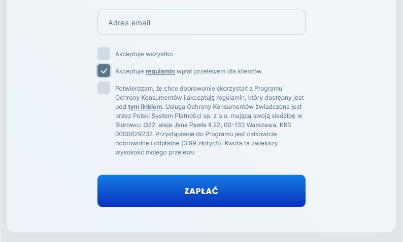 - Kliknięcie przycisku "Przejdź do płatności" otwiera stronę serwisu obsługującego realizację zapłaty blikiem bądź przelewem zwykłym: